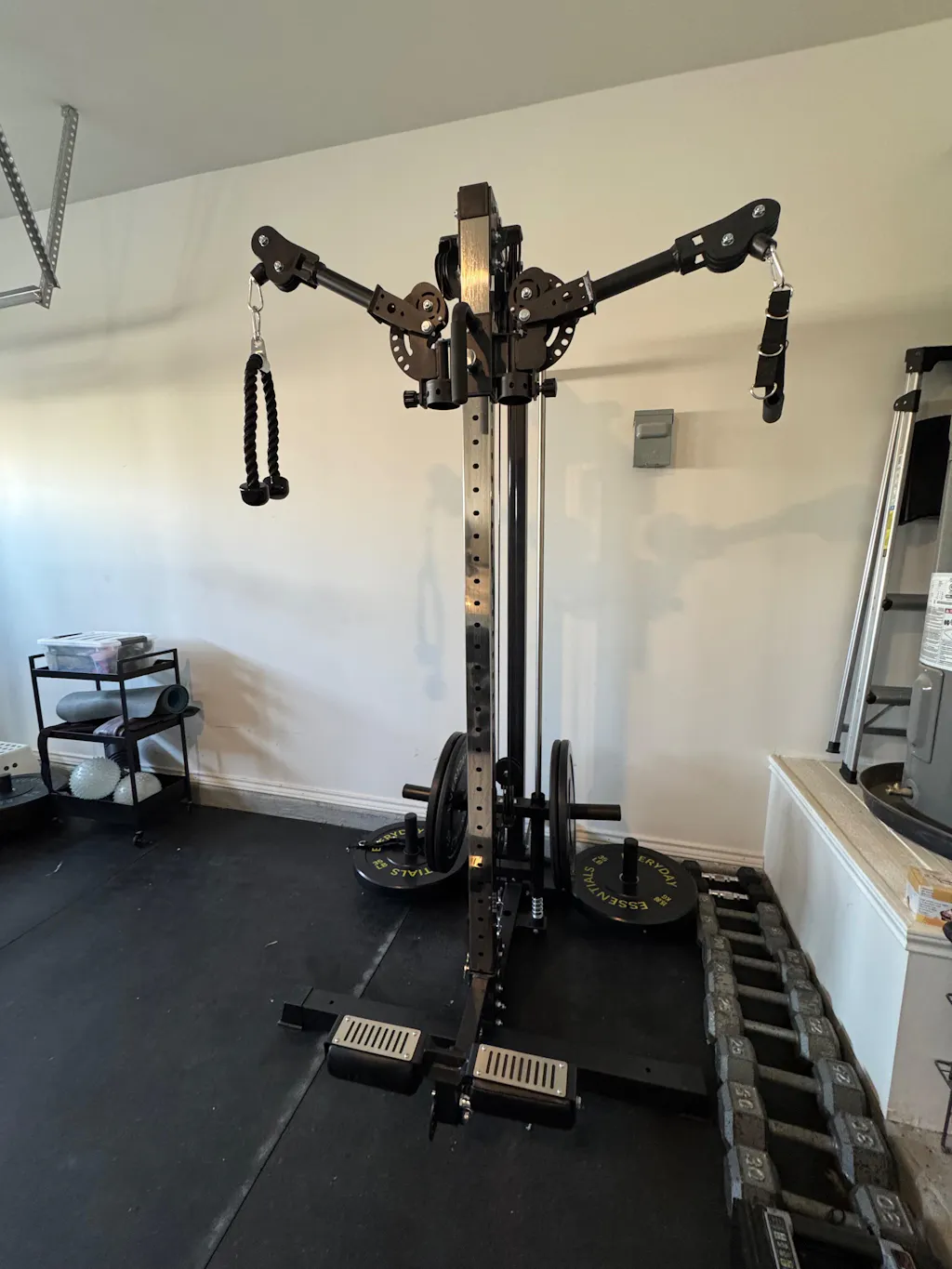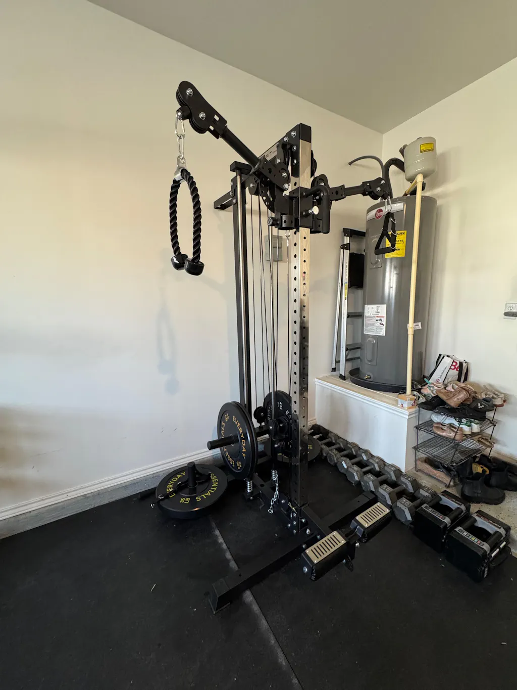 • Complete Attachment Included -- Comes with all you need: 4 x plate holders, lat-pulldown bar, knee pad/row pedal, handle strap, tricep rope and more, plus wall-mounting hardware for easy setup.