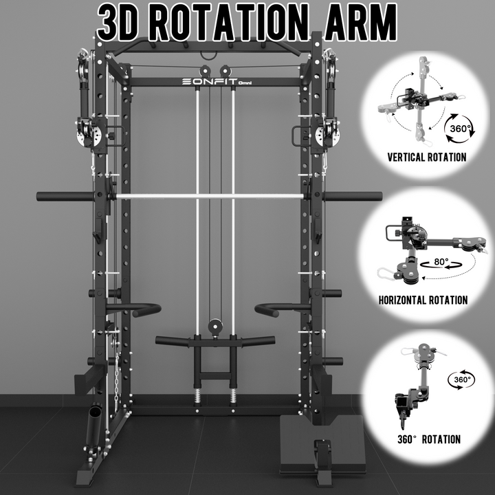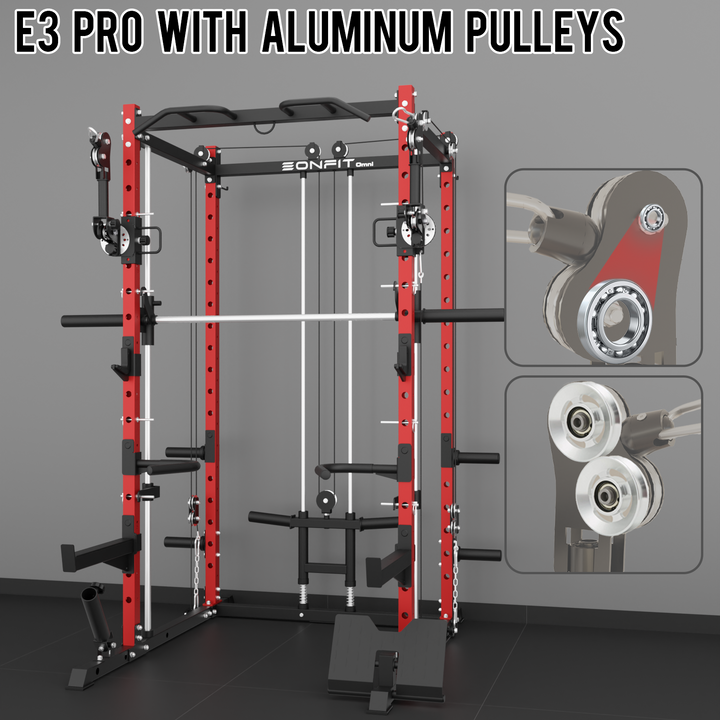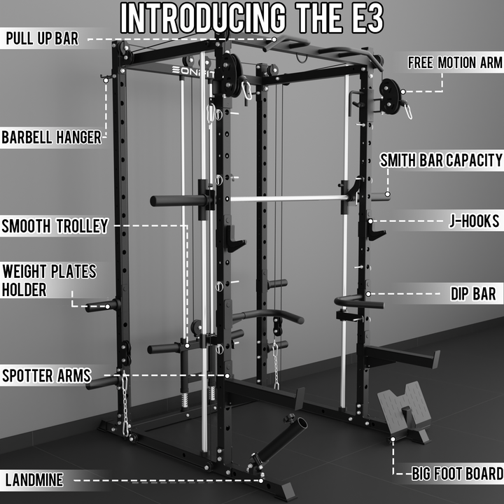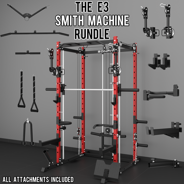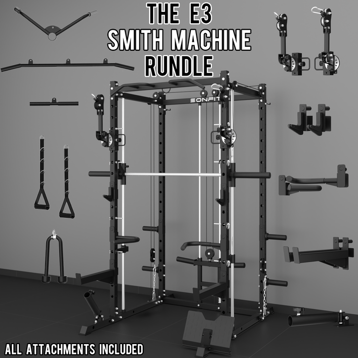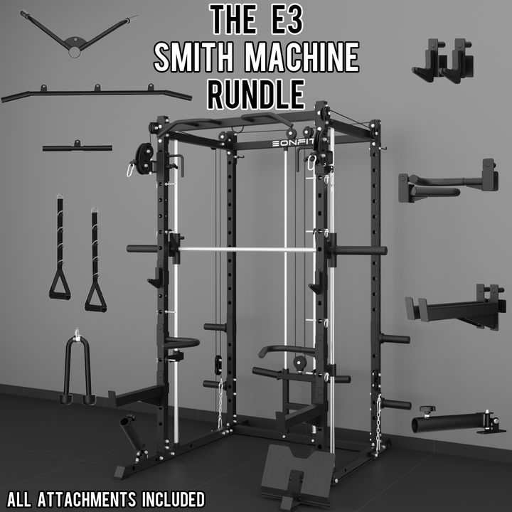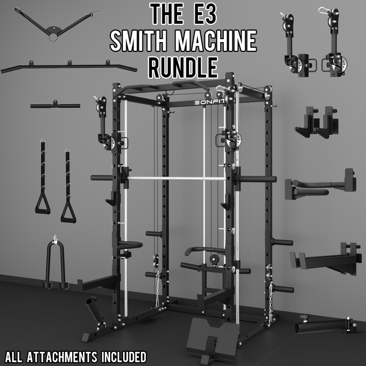 - EONFITOmni E3 Smith Machine home gym starts with the E2 power rack as a foundation. It comes with a Smith bar and 4 pairs of lock pins. The unique design lock pins are compatible with our Pivot Arms and easy to attach, detach, or adjust on the uprights to suit any purpose of exercises. It's a great versatile smith machine with power rack, squat rack, cable crossover machine, lat pulldown system, functional trainer, chin-up, and landmine core trainer.