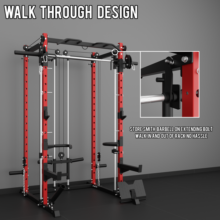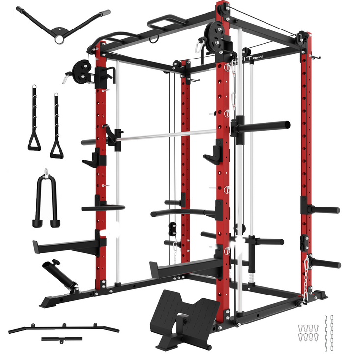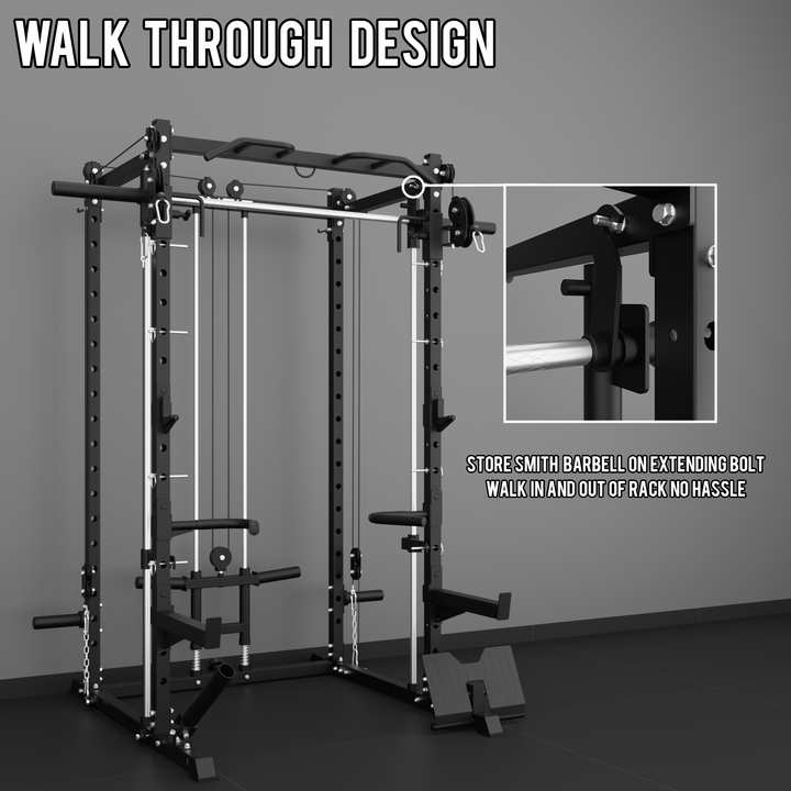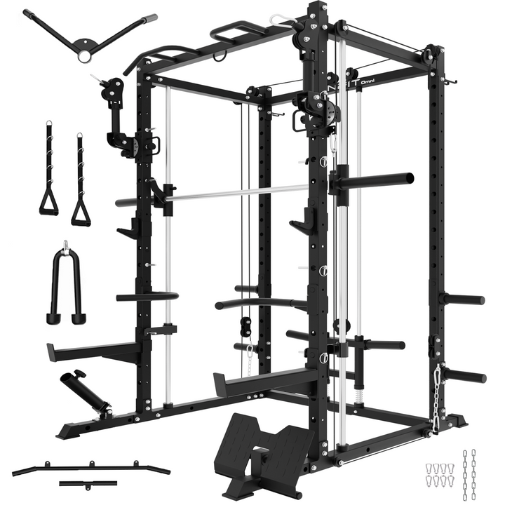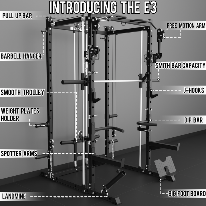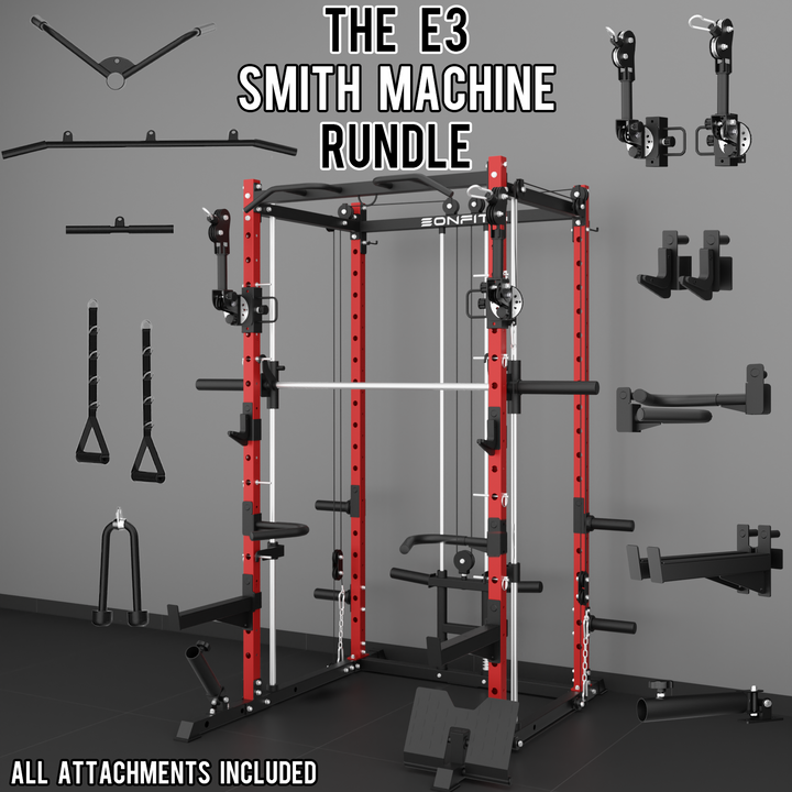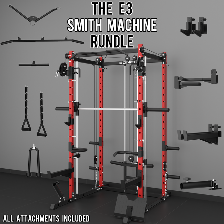 - EONFITOmni E3 Smith Machine home gym starts with the E2 power rack as a foundation. It comes with a Smith bar and 4 pairs of lock pins. The unique design lock pins are compatible with our Pivot Arms and easy to attach, detach, or adjust on the uprights to suit any purpose of exercises. It's a great versatile smith machine with power rack, squat rack, cable crossover machine, lat pulldown system, functional trainer, chin-up, and landmine core trainer.