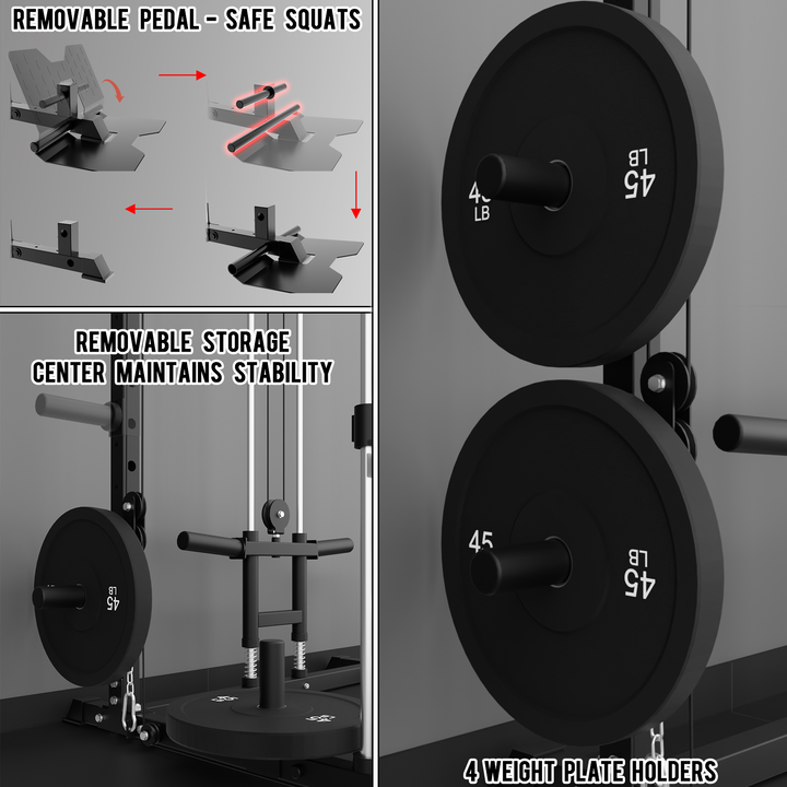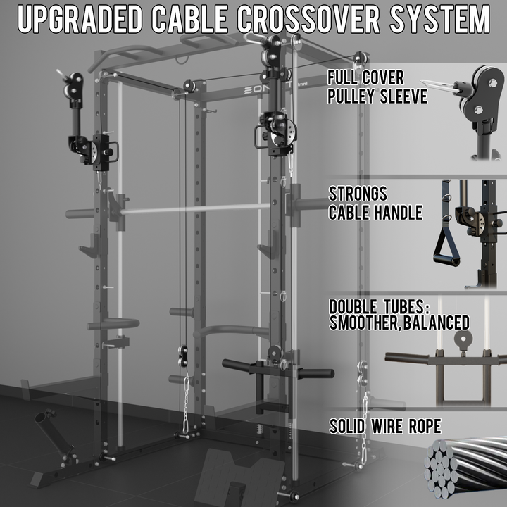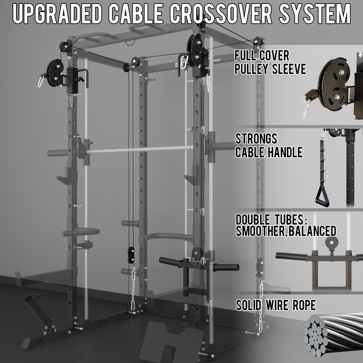- Standard Version with Cable Crossover Machine The home gym squat cage is equipped with PU cables and a pulley system to ensure reliable performance. With 16 adjustable height positions, it can cater to various training needs such as fly, lat pull down, lifting, curls, rows, and more.