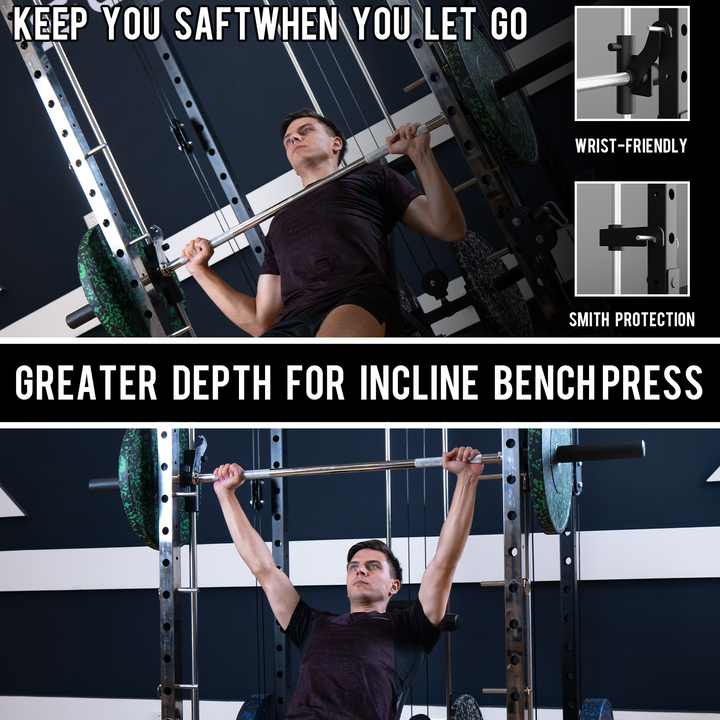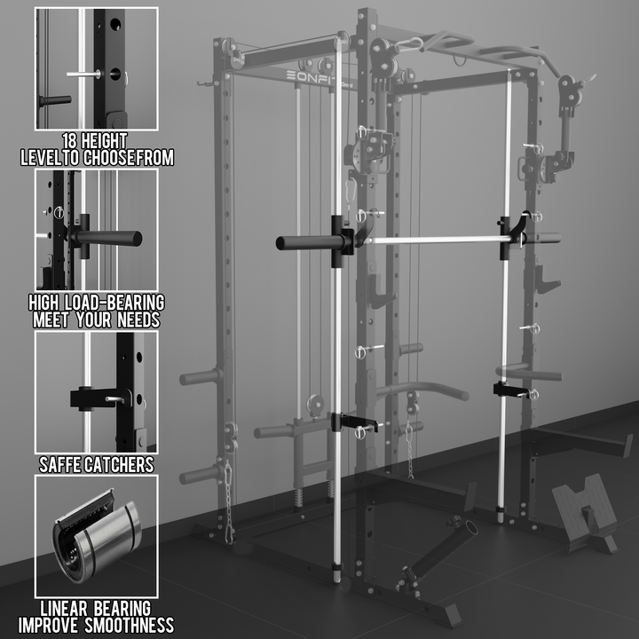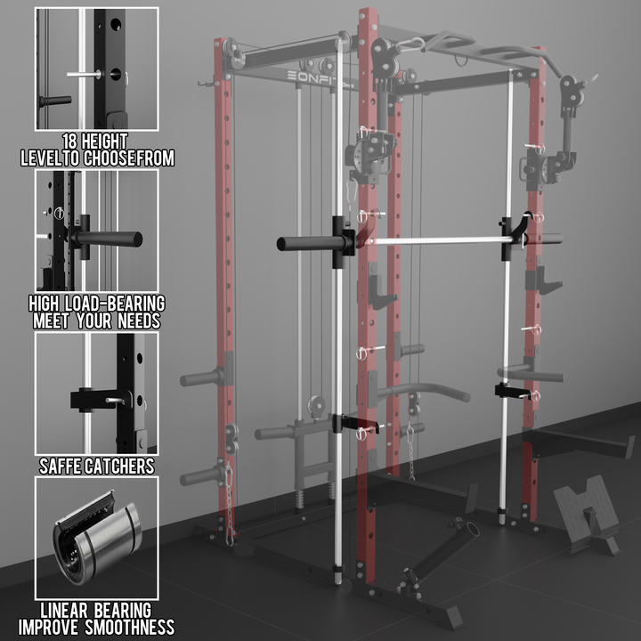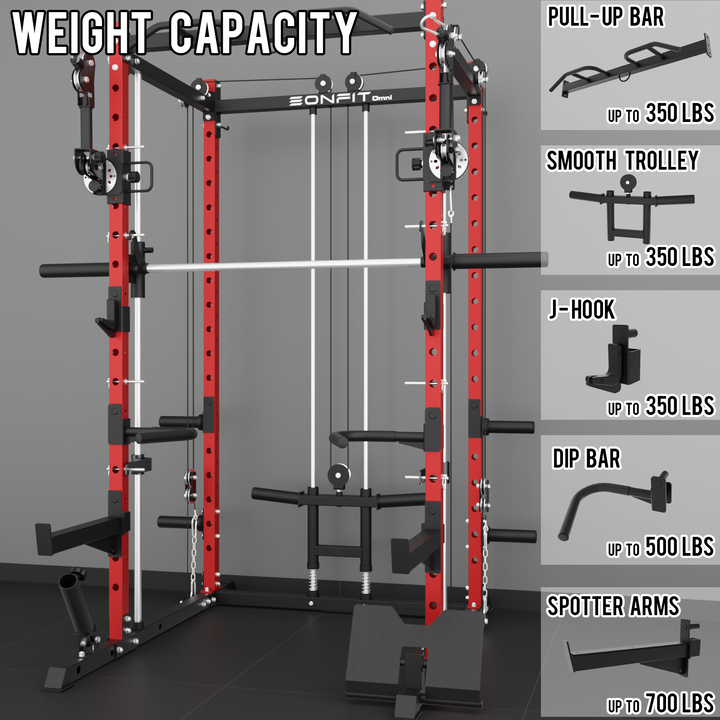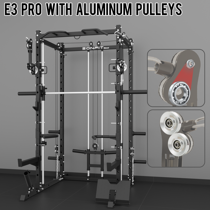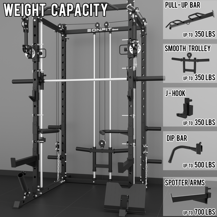 - EONFITOmni E3 Smith Machine is incredibily smooth, strong (Standard version: 500 lbs weight rating; Pro version: 400 lbs weight rating) and perfect for compound movements so you can push yourself to the limit on Shoulder Presses, Calf Raises and Glute Building movements. The guide rails (premium solid steel) deliver ultra-smooth movement with premium bearings during the workouts, as well as safe lock and release mechanics and safety arms allowing the users to max out their training safely.