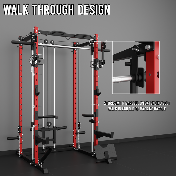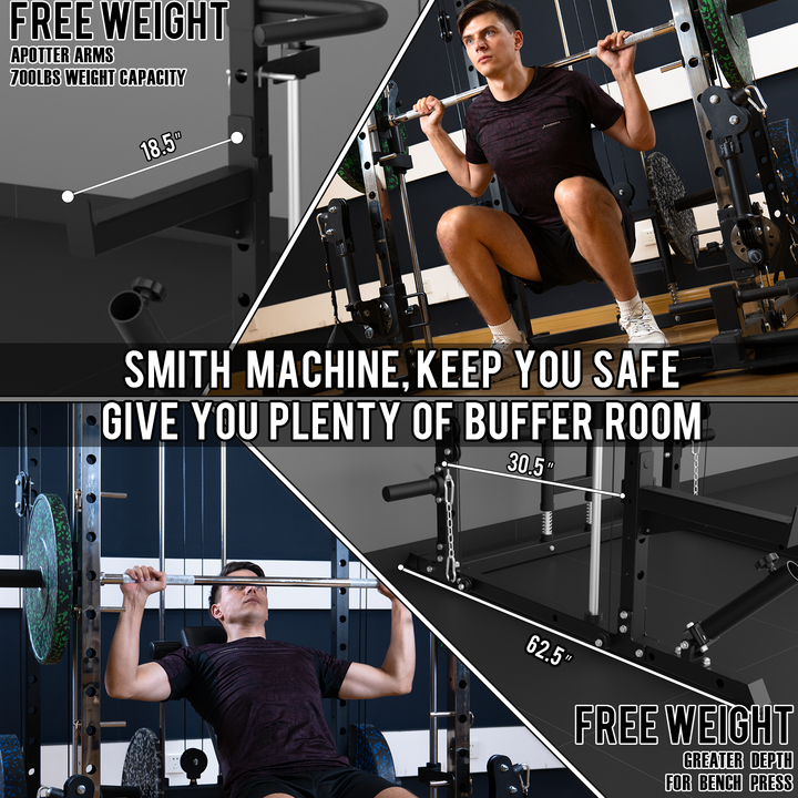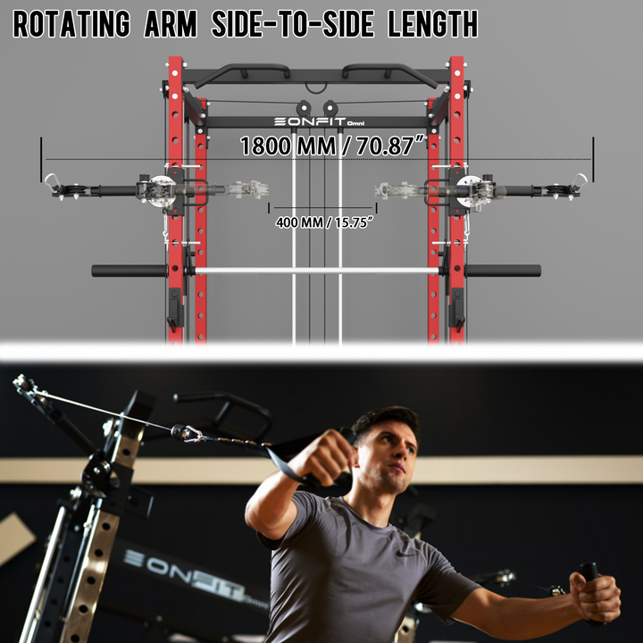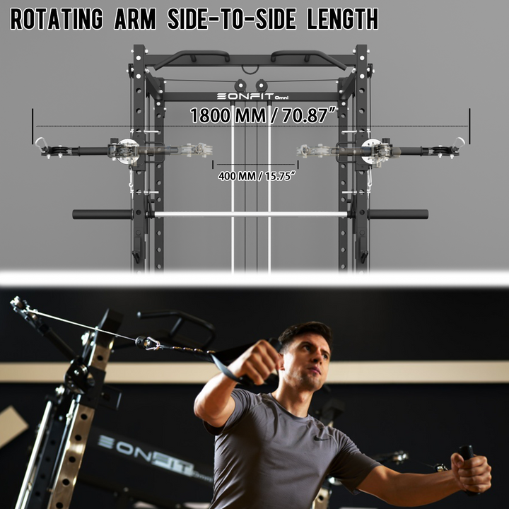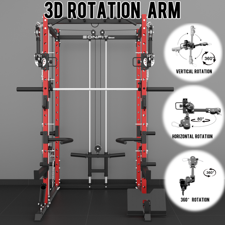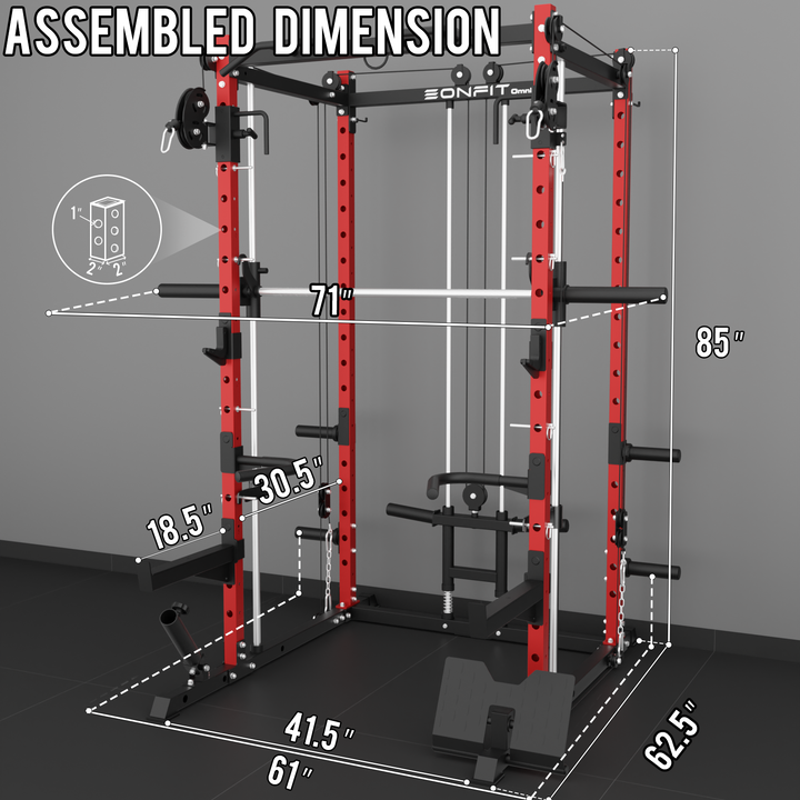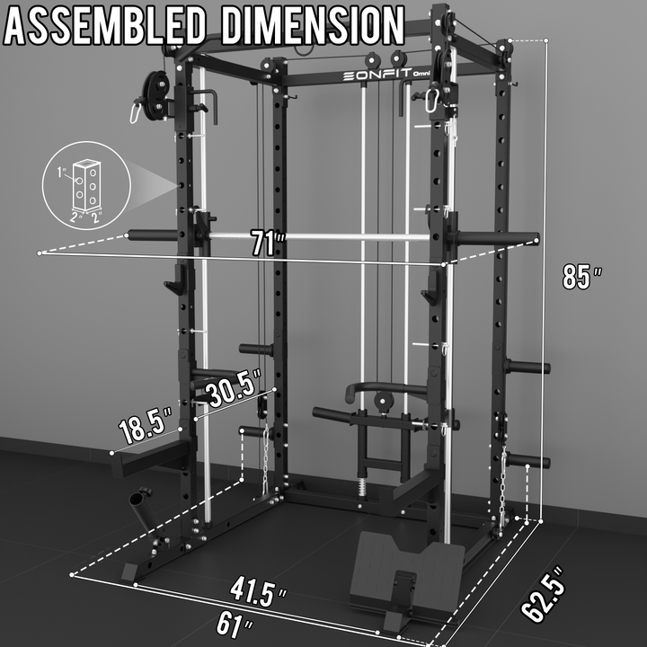 - Small Footprint for Home Gym -- EONFITOmni E3 smith machine functional trainer setup dimensions is only 62.5"L x 71"W x 85"H. You can perform all the same exercises you did at your local gym with the flexibility to upgrade as your fitness goals. It's time to build you own gym in the safety and privacy of your home, just cancel your commercial gym membership.