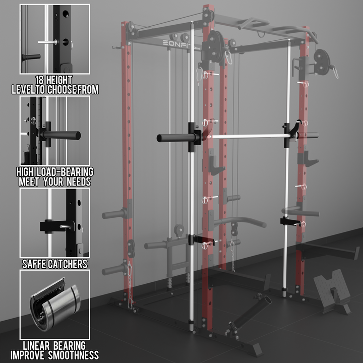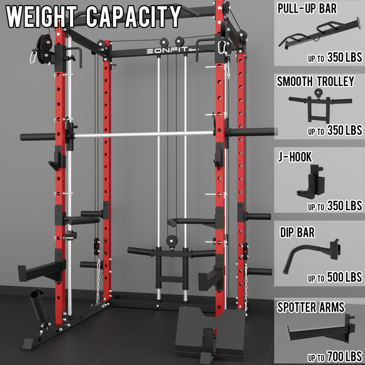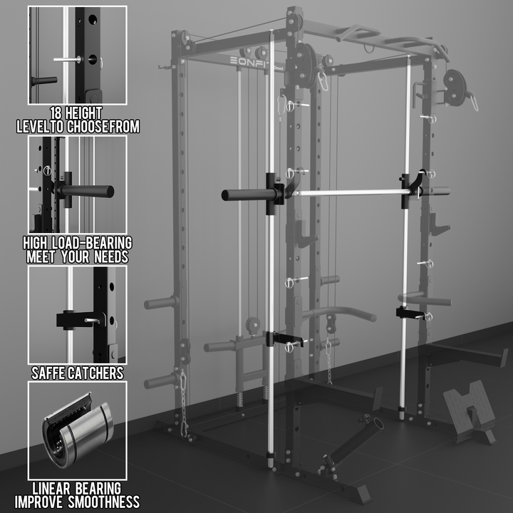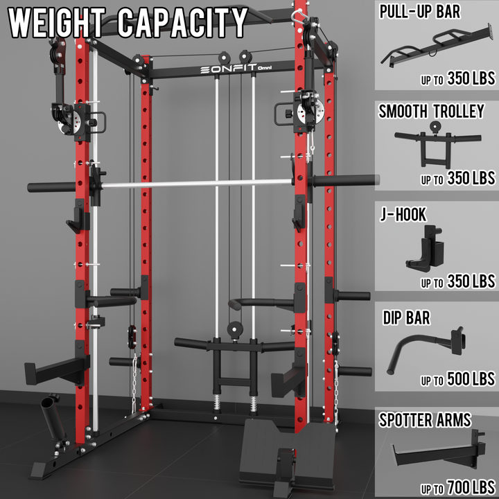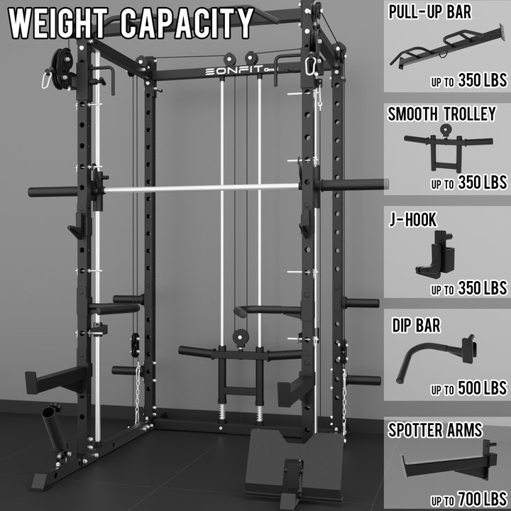 - Premium Quality -- EonfitOmni E3 Smith Machine power cage manufactured using state of the art fully automated laser cutting and robotic welding technology. It is tested to meet the safety standards and weight ratings to deliver the safest and highest quality power rack to the training facility. It is built with 2"x2" 14 gauge steel, high Quality electrostatic powder coating finish, weight capacity up to 1000lbs (Standard version: weight capacity up to 1000 lbs; Pro version: weight capacity up to 1500 lbs)