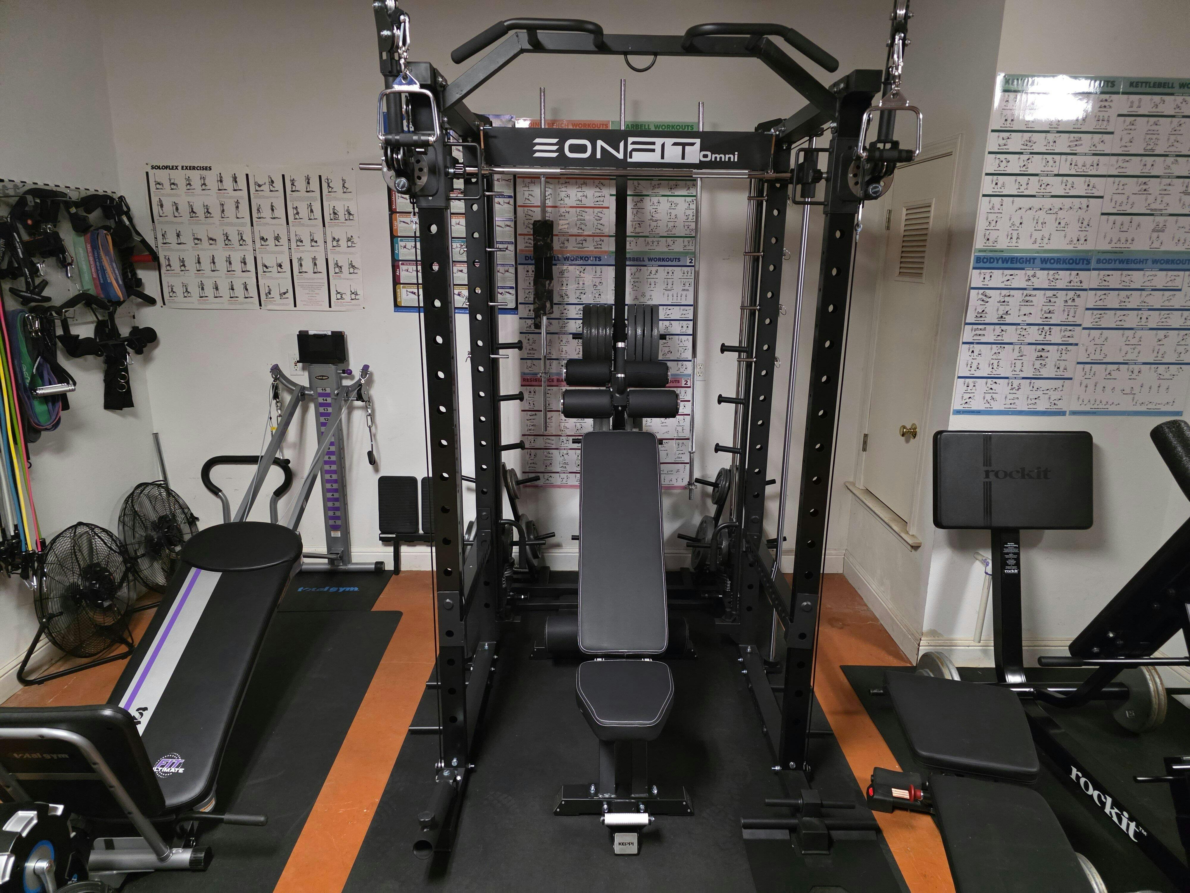 - 【11-In-1 Gym Station】EonfitOmni E5 power cage home gym Combines Power Cage/Functional Trainer/Cable Crossover/Two Lat Pull down Station /Low Row Station(includes footplate attachment)/ Smiths Machine /Vertical Leg Press (Include quick-locking leg press foot plate)/Chin Station /Dip Station /Core trainer/Landmine Station /Suspension Trainer.
