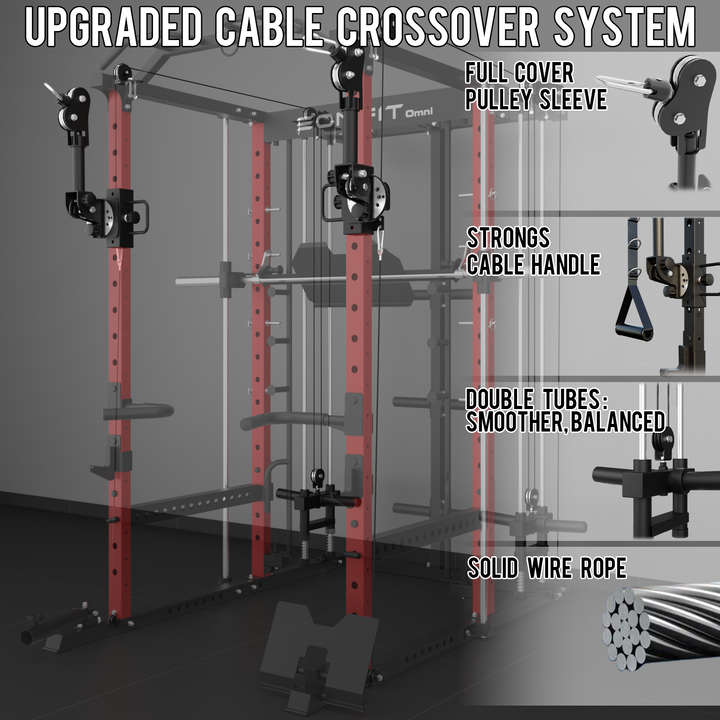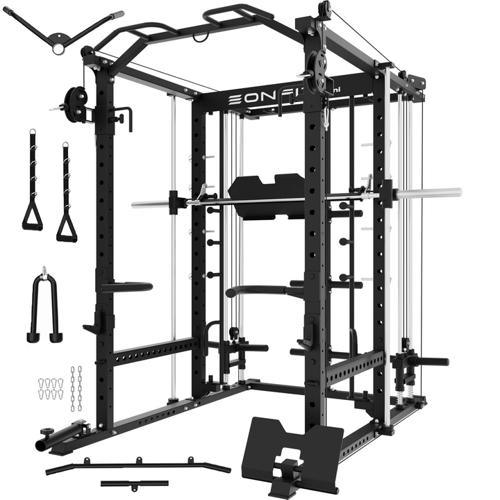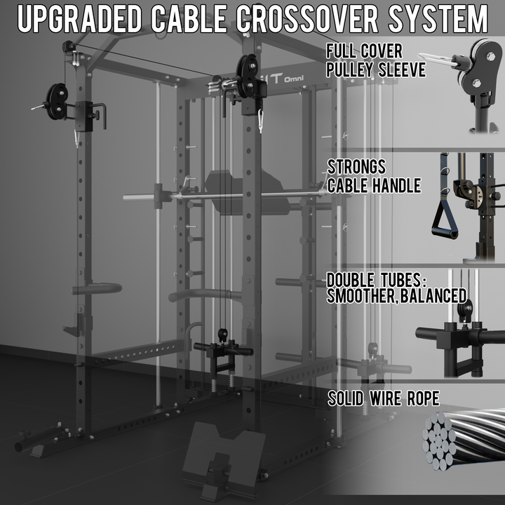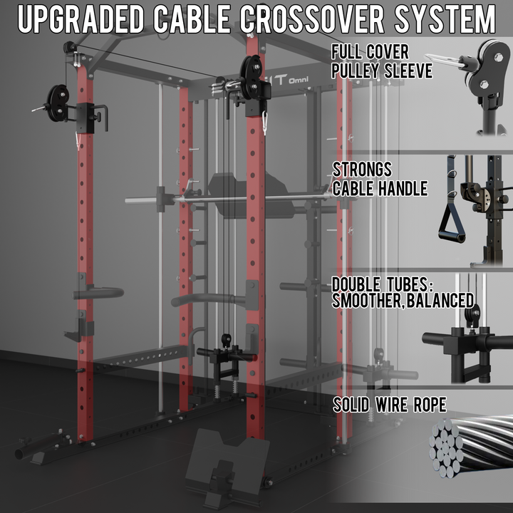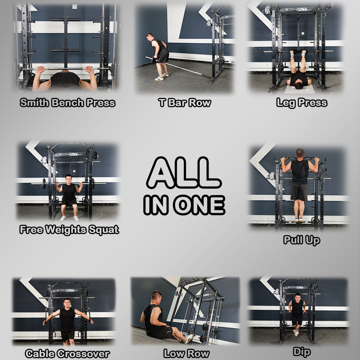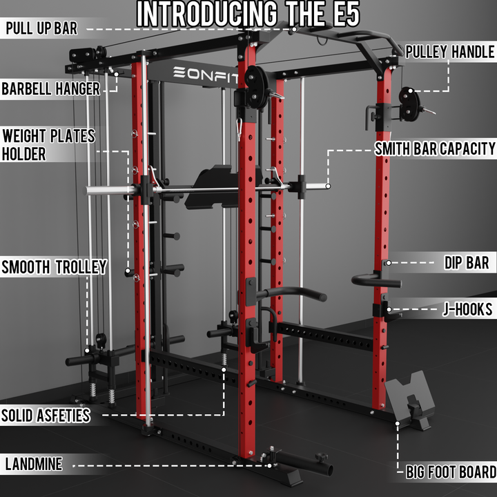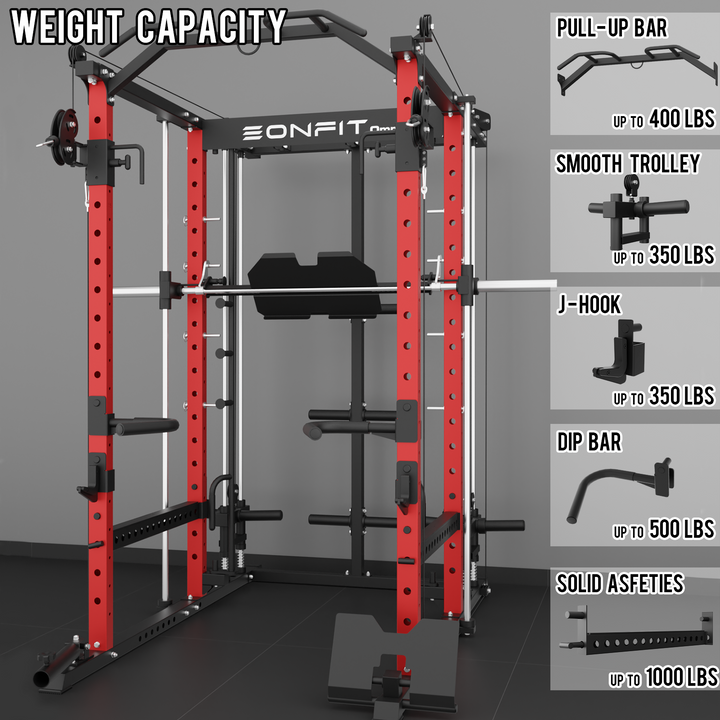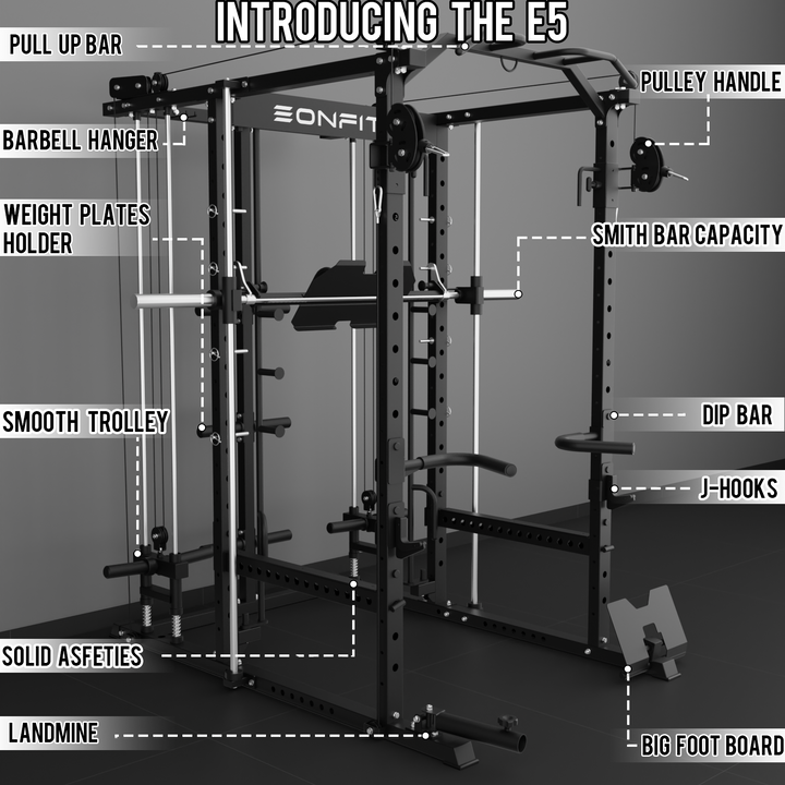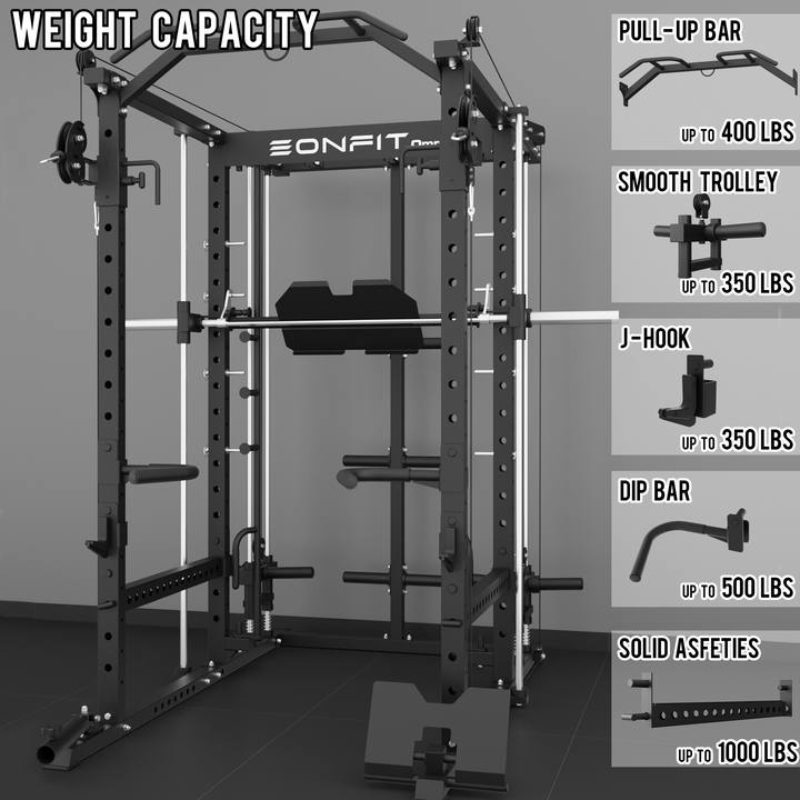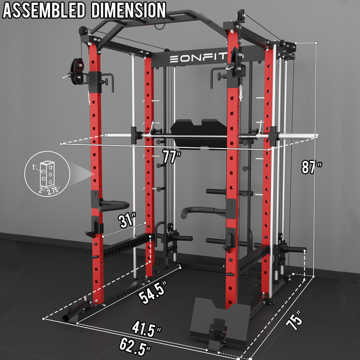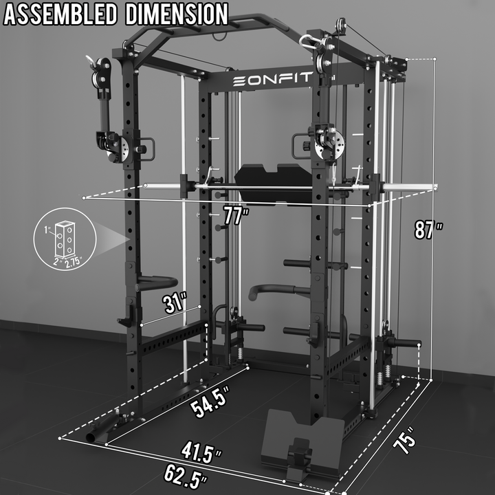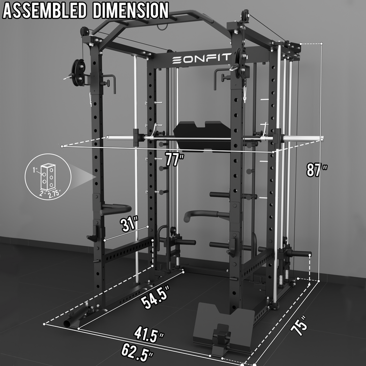 - 【11-In-1 Gym Station】EonfitOmni E5 power cage home gym Combines Power Cage/Functional Trainer/Cable Crossover/Two Lat Pull down Station /Low Row Station(includes footplate attachment)/ Smiths Machine /Vertical Leg Press (Include quick-locking leg press foot plate)/Chin Station /Dip Station /Core trainer/Landmine Station /Suspension Trainer.
