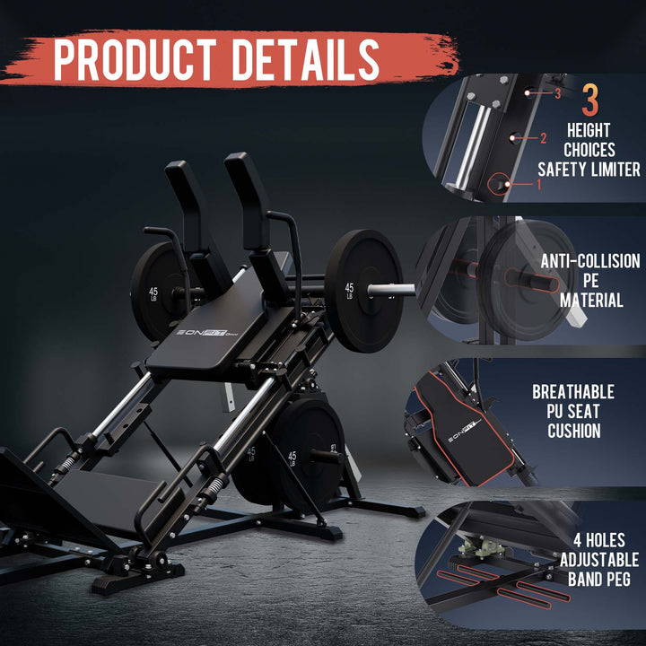 【Versatile 3-in-1 Design】Transform your workouts with our versatile leg press machine, seamlessly switching between leg press, hack squat, and reverse hack squat. You can effectively target and tone various muscle groups, including the glutes, quads, calves and hamstrings. This eliminates the need for separate machines dedicated to specific muscle groups, saving both space and money for those seeking a comprehensive strength training solution.