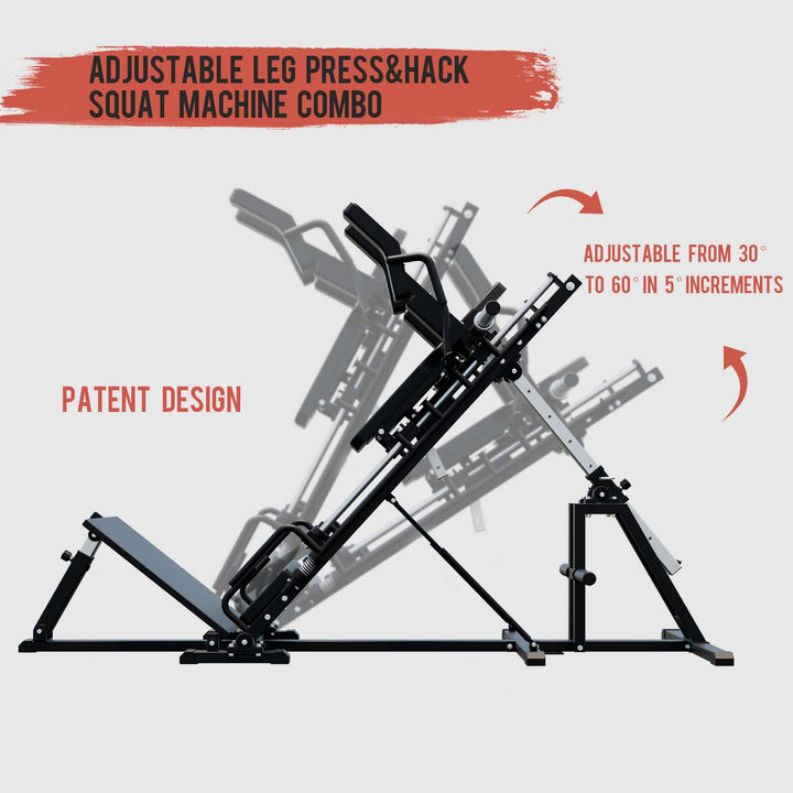 【Unique Angle Adjustment】EonfitOmni 3-IN-1 Leg Press Hack Squat Machine boasts a unique adjustable angle design, ranging from 30 to 60 degrees with every 5-degree increment, catering to your diverse workout needs. This patented feature sets us apart from other brands, offering a customizable workout experience that is truly one-of-a-kind. With the inclusion of gas springs, adjusting the angle on our machine is not only safe but also requires minimal effort. Users can seamlessly transition between different exercises without compromising safety or convenience.