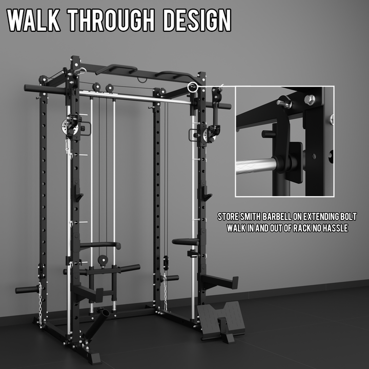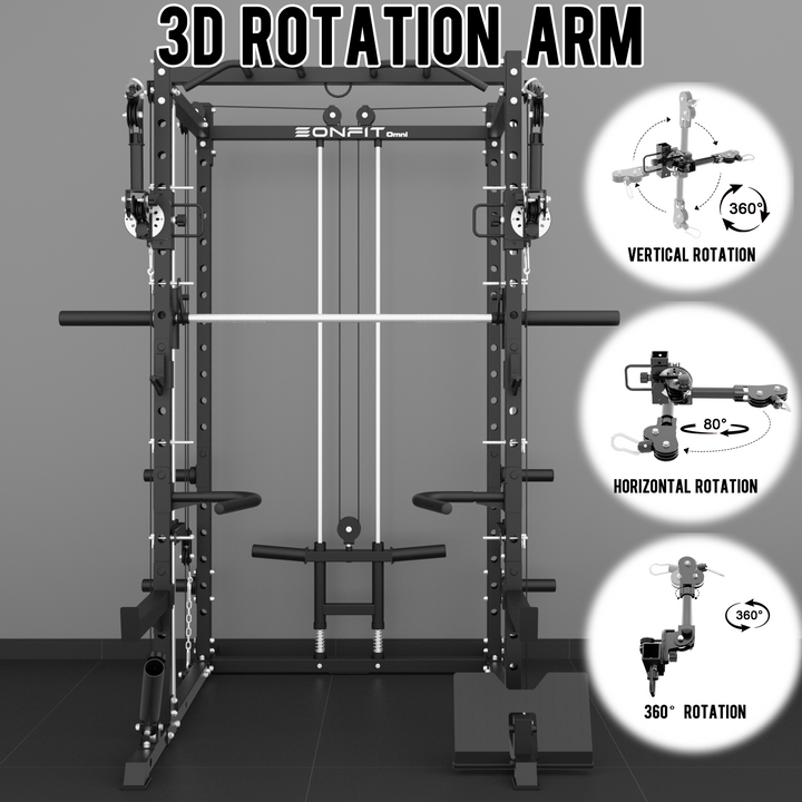 - EONFITOmni E3 Smith Machine home gym starts with the E2 power rack as a foundation. It comes with a Smith bar and 4 pairs of lock pins. The unique design lock pins are compatible with our Pivot Arms and easy to attach, detach, or adjust on the uprights to suit any purpose of exercises. It's a great versatile smith machine with power rack, squat rack, cable crossover machine, lat pulldown system, functional trainer, chin-up, and landmine core trainer.
