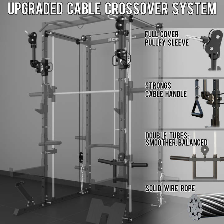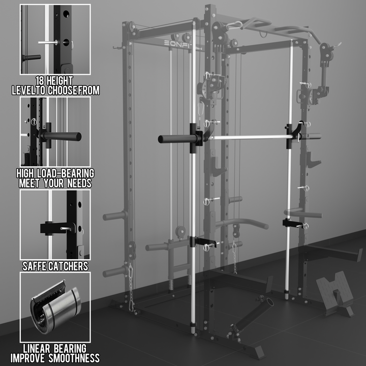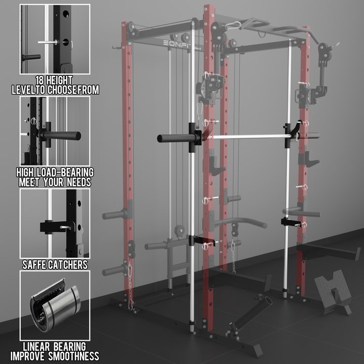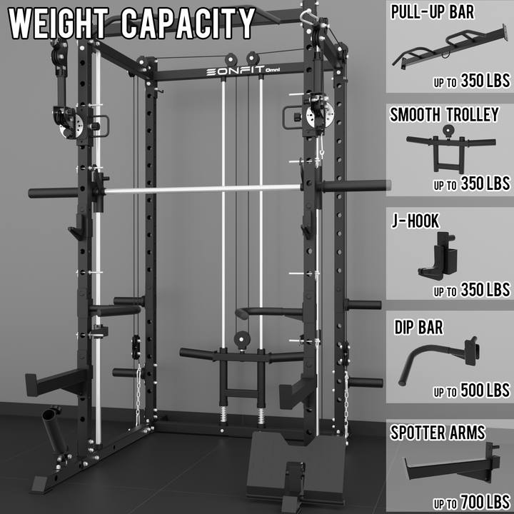 - Premium Quality -- EonfitOmni E3 Smith Machine power cage manufactured using state of the art fully automated laser cutting and robotic welding technology. It is tested to meet the safety standards and weight ratings to deliver the safest and highest quality power rack to the training facility. It is built with 2"x2" 14 gauge steel, high Quality electrostatic powder coating finish, weight capacity up to 1000lbs (Standard version: weight capacity up to 1000 lbs; Pro version: weight capacity up to 1500 lbs)