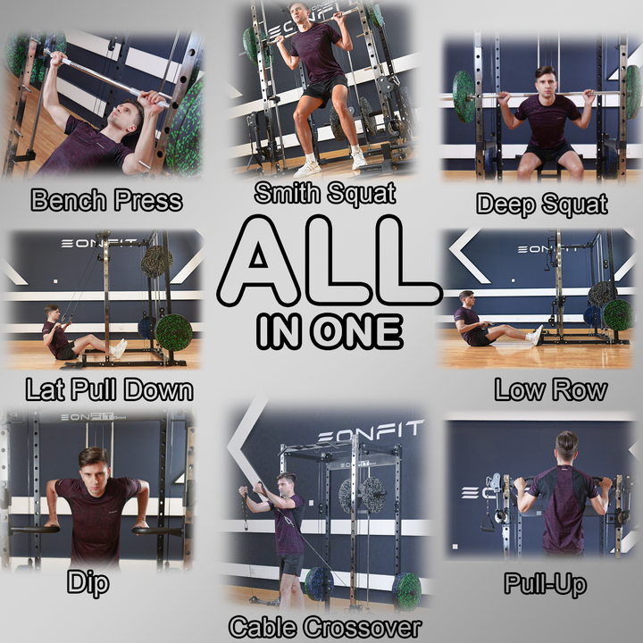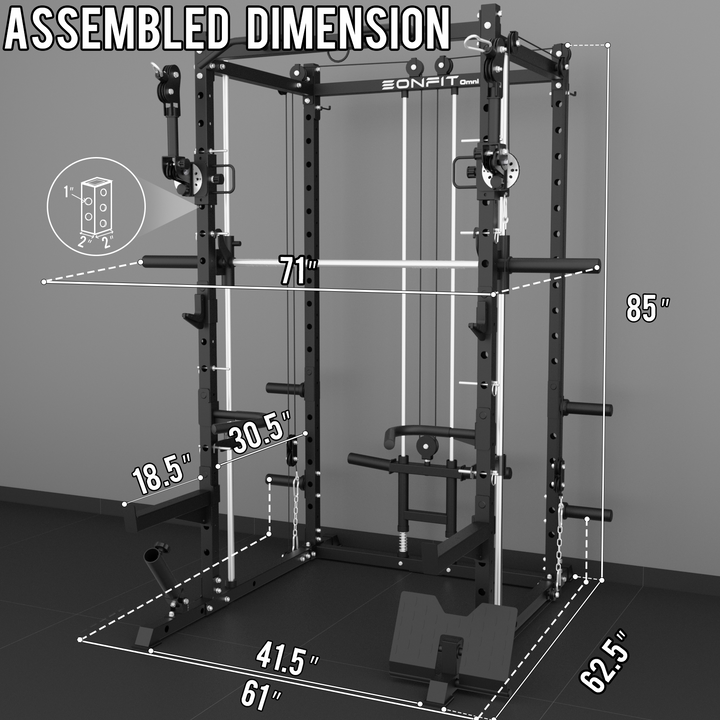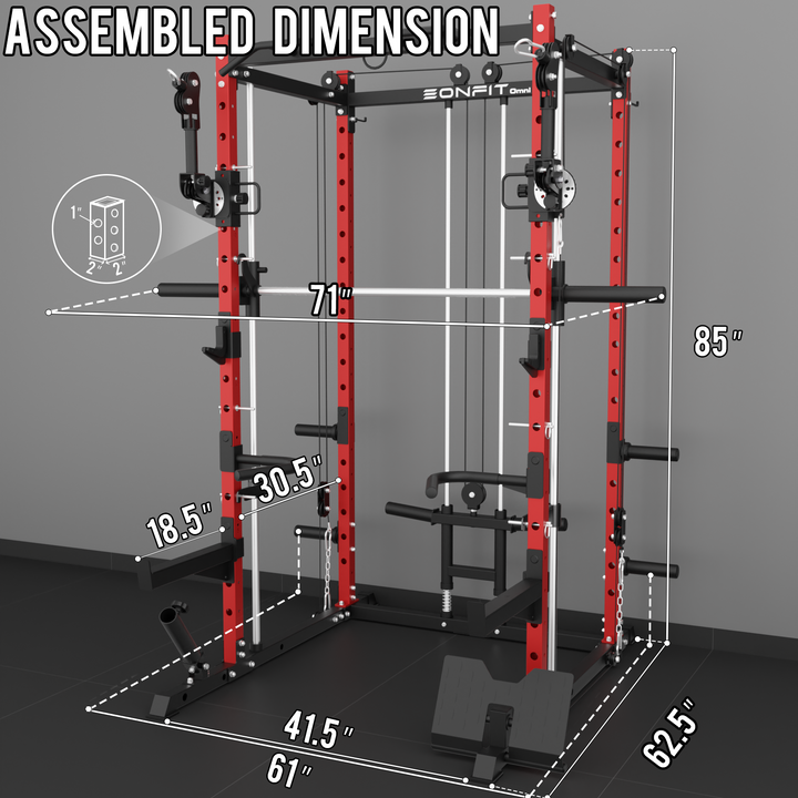 - Small Footprint for Home Gym -- EONFITOmni E3 smith machine functional trainer setup dimensions is only 62.5"L x 71"W x 85"H. You can perform all the same exercises you did at your local gym with the flexibility to upgrade as your fitness goals. It's time to build you own gym in the safety and privacy of your home, just cancel your commercial gym membership.