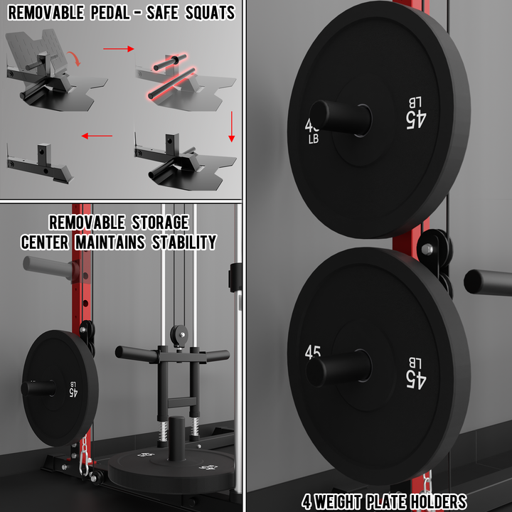 - EONFITOmni E3 Smith Machine is incredibily smooth, strong (Standard version: 500 lbs weight rating; Pro version: 400 lbs weight rating) and perfect for compound movements so you can push yourself to the limit on Shoulder Presses, Calf Raises and Glute Building movements. The guide rails (premium solid steel) deliver ultra-smooth movement with premium bearings during the workouts, as well as safe lock and release mechanics and safety arms allowing the users to max out their training safely.