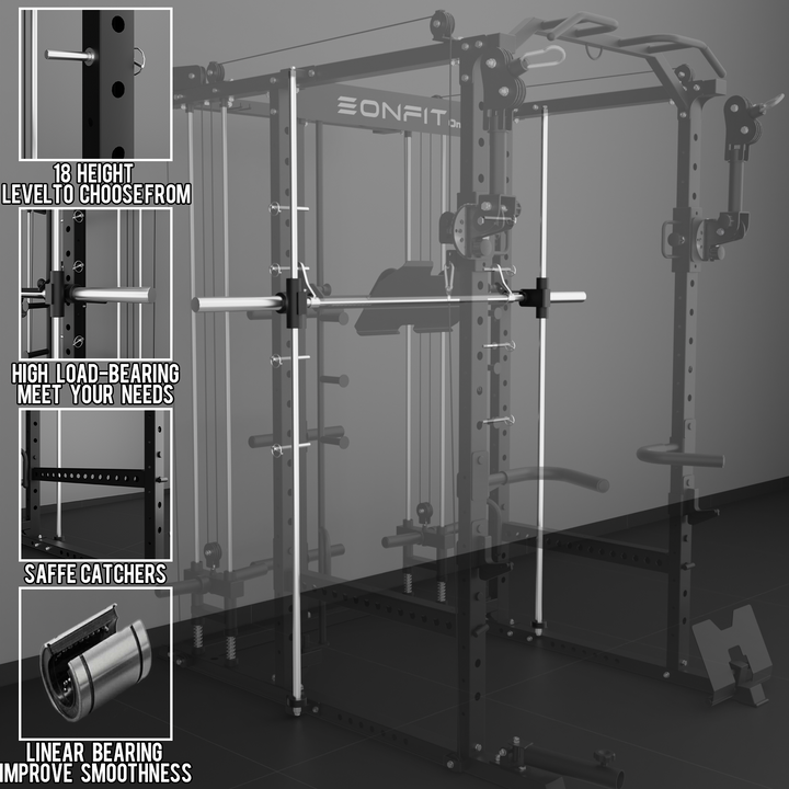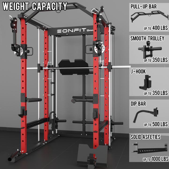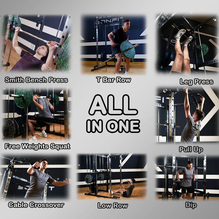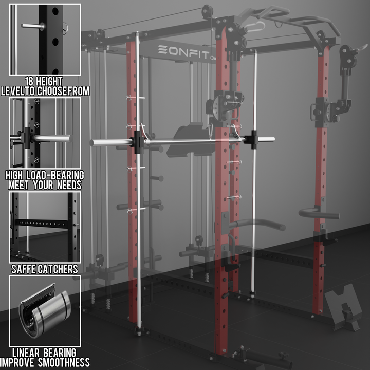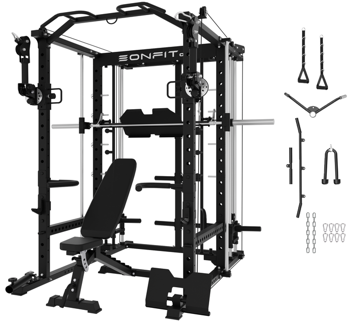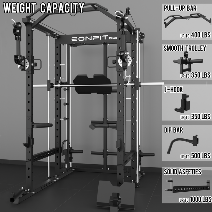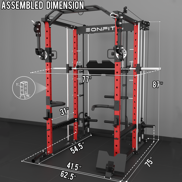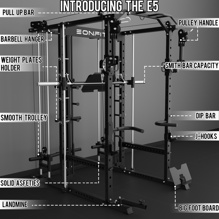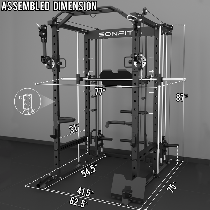 - 【11-In-1 Gym Station】EonfitOmni E5 power cage home gym Combines Power Cage/Functional Trainer/Cable Crossover/Two Lat Pull down Station /Low Row Station(includes footplate attachment)/ Smiths Machine /Vertical Leg Press (Include quick-locking leg press foot plate)/Chin Station /Dip Station /Core trainer/Landmine Station /Suspension Trainer.