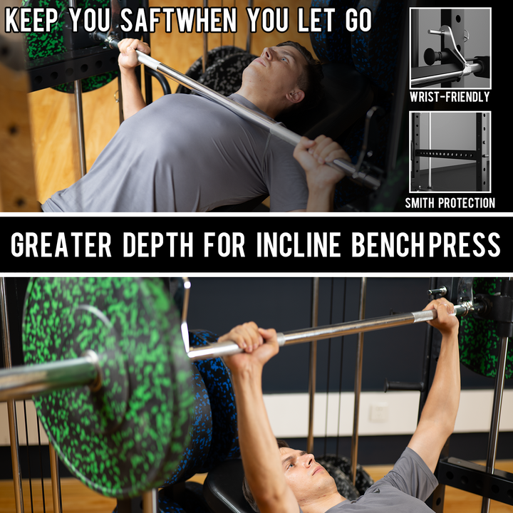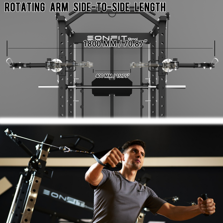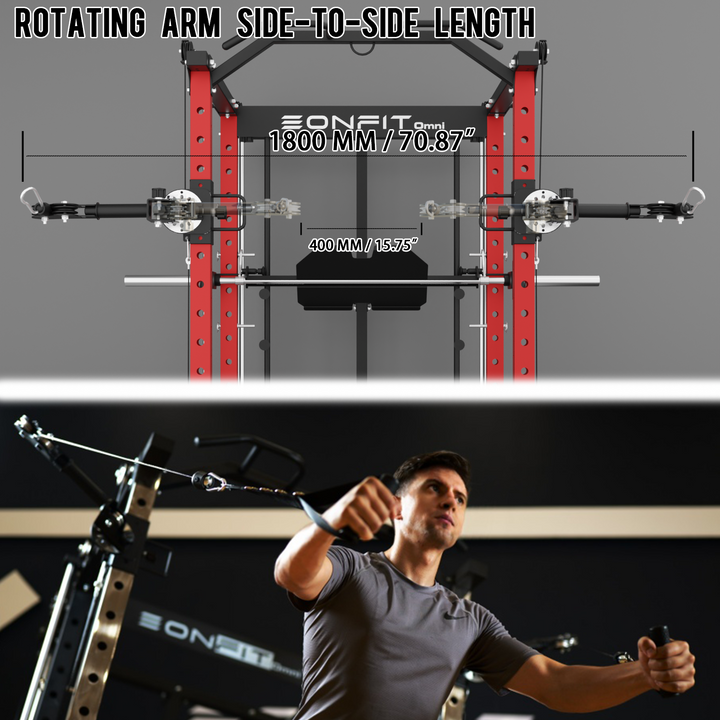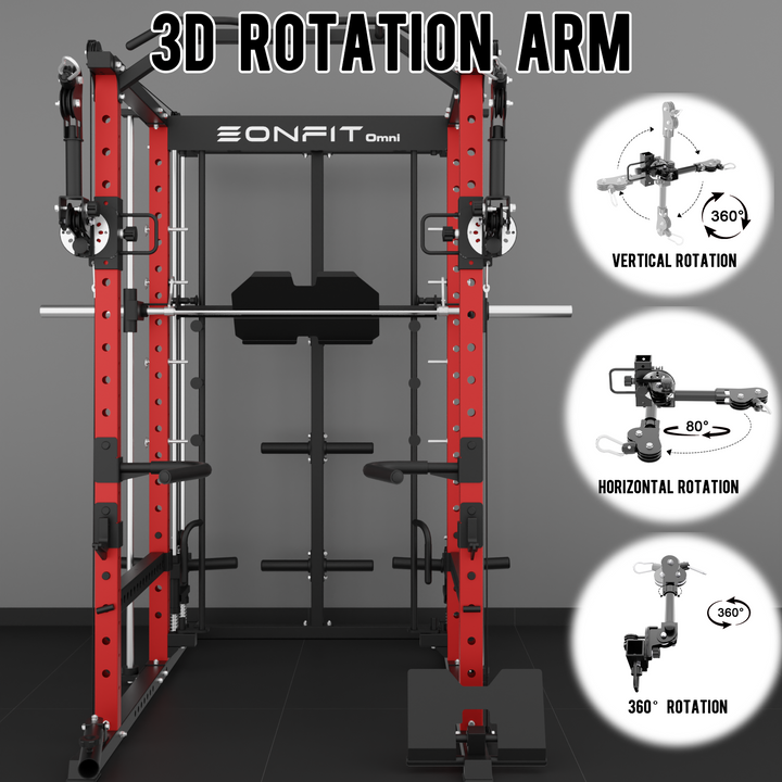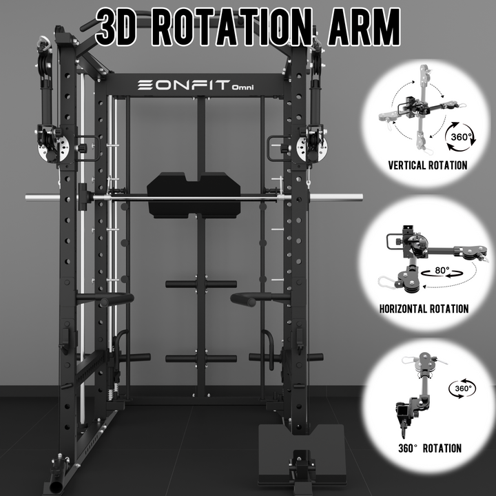 - 【Pro Version Multifunctional Free Motion Arms】The power cage smiths machine features two unique free motion arms that can move up and down as well as rotate 360 degrees, providing you with over 150 different ways to train. This innovative design sets our E5 smiths machine apart from the competition and ensures a versatile and effective workout experience.