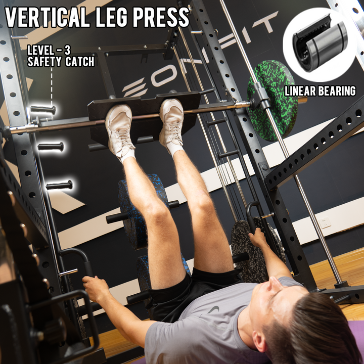 - 【Vertical Leg Press】Attached and detached smith safety pin make the vertical leg press more smooth. The E5 smith machine comes complete with an array of accessories, including a Landmine, T-bar, Dip Handles, J-hooks, Safety Spotter Arms, Band Peg, two Lat Pull Down handles, Tricep rope, leg press plate attachment and a Rowing Footplate. These additions significantly expand the machine's capabilities, delivering a comprehensive and varied home gym experience to users